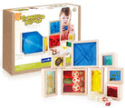 What can we find today? Collect trinkets, natural materials and sensory objects to place in the beautiful Treasure Blocks. Smooth hardwood frames with inset, transparent acrylic windows have a removable panel to place small objects to observe or display. Ideal for color exploration and light table activities.